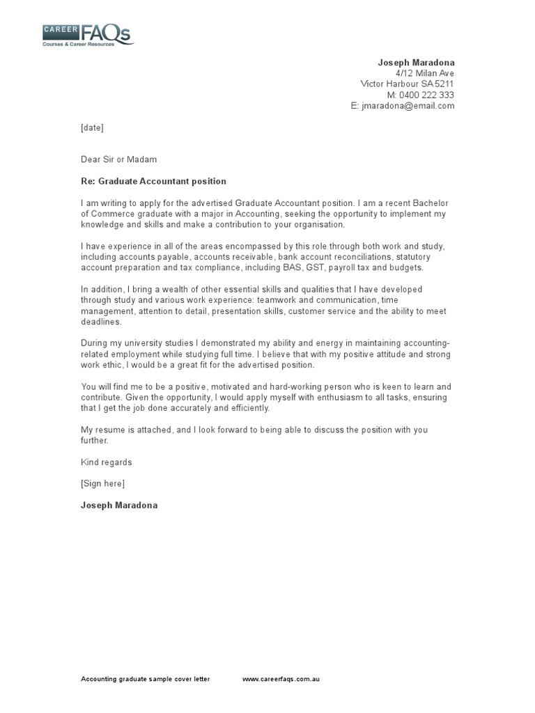 I am excited to be applying for the position of graduate accountant, which was advertised on the company website. See sample accounting cover letter helps to understand how to highlight your skills and capabilities and help to make it more interesting. Tips for writing a cover letter recent graduate cover letter example Whether you are a fresh graduate aiming to be a professional in the finance and accounting industry, or someone who is looking for a better company, this article is for you to use as a guide. So, how well written is your cover letter?